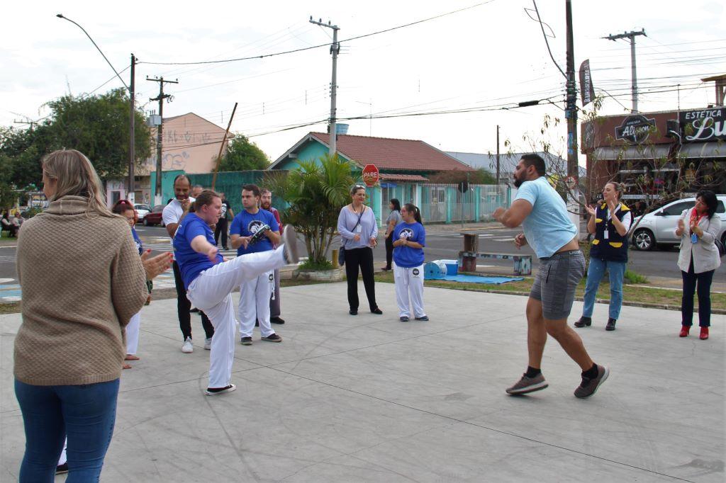 A comunidade do Bairro Santo Inácio, pessoas que estavam na tradicional feira do produtor e pacientes da Apae foram convocados para entrar na roda e a participarem da luta junto do Mestre Trança durante a tarde. A diretora da SMCEL Michele Darolt, explicou sobre a iniciativa do evento e da homenagem. “Juntamente da Apae pensamos em promover a luta de forma coletiva, aberta, para homenagear essa arte que é tão importante para o nosso município e para os seus moradores”, comentou a diretora.
