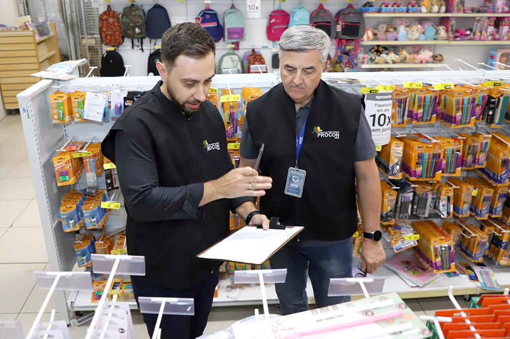 Também foram analisados produtos como canetinhas, lápis de cor, colas, tesouras e canetas, todos apresentando variação de preços conforme marca e local de venda, sem que fossem identificadas irregularidades ou valores abusivos nos estabelecimentos fiscalizados.