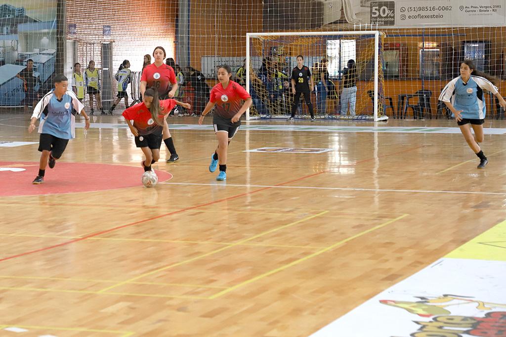 A quadra do Ginásio Municipal Edgar Piccioni, no Bairro Olímpica, foi ocupada, nesta segunda-feira (6), por alunas/atletas que iniciaram o torneio de futsal, categoria Infantil, naipe Feminino, dos Jogos Estudantis de Esteio (Jedes) 2026.