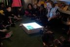 De dentro de uma caixa que emanava uma suave luz azul, personagens e objetos iam surgindo, um a um, hipnotizando os pequenos espectadores. A luz, que refletia no rosto de cada criança, parecia iluminar também a curiosidade. Ali, o livro deixou de ser um objeto estático para se tornar uma experiência sensorial, onde o limite entre o real e o imaginário era tão tênue quanto o brilho azulado que preenchia a sala.